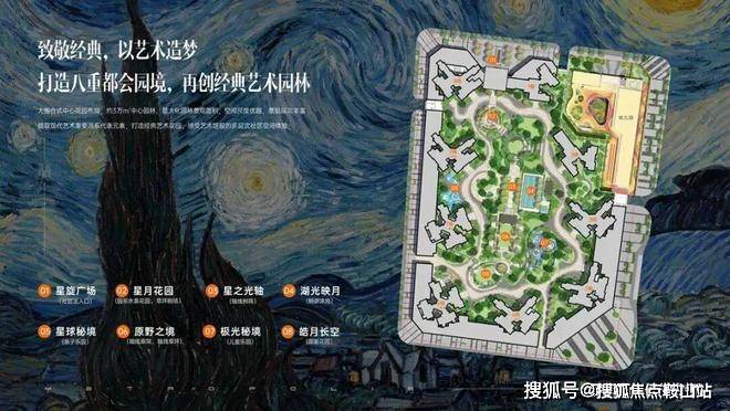 园林设计项目以"星空花园"为主题,打造约3万㎡围合式园林,相当于4.2个标准足球场大小。园林设计灵感来源于梵高《星月夜》,构建"八重都会园境":