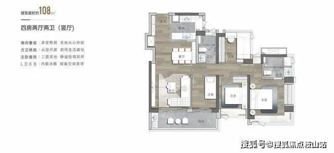 108㎡四房两厅两卫:竖厅格局,LDKB一体化设计,动静分区,客厅3.7米开间,U型厨房,得房率约79.96%,西南或东南朝向。