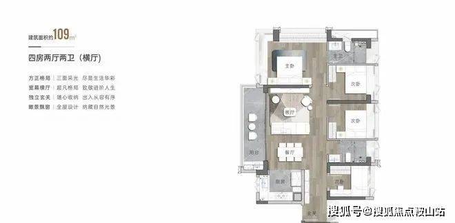 109㎡四房两厅两卫:横厅南北通透格局,客餐厅6米开间,U型厨房,公卫三段式分离设计,得房率约79.96%,阳台主朝西南向。