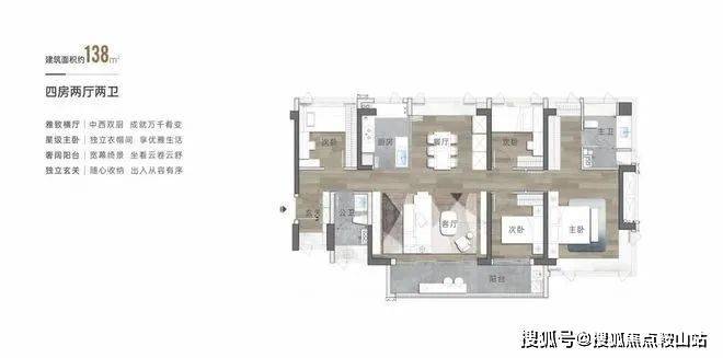 138㎡四房两厅两卫:横厅南北通透格局,客厅5.7米开间,L型厨房,主卧大套间设计,得房率约81.49%,阳台主朝西南或东南向。