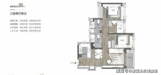 95㎡三房两厅两卫:竖厅格局,LDKB一体化设计,动静分区,客厅3.6米开间,U型厨房,得房率约79.96%,西南或东北朝向。