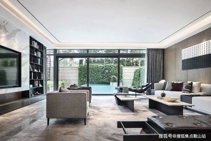 会客厅呈开放式设计,简约线条勾勒出场域的大气之感,富有质感的材料低调中透出精致与奢华,透过玻璃门视觉延伸到配有露天泳池的庭院。