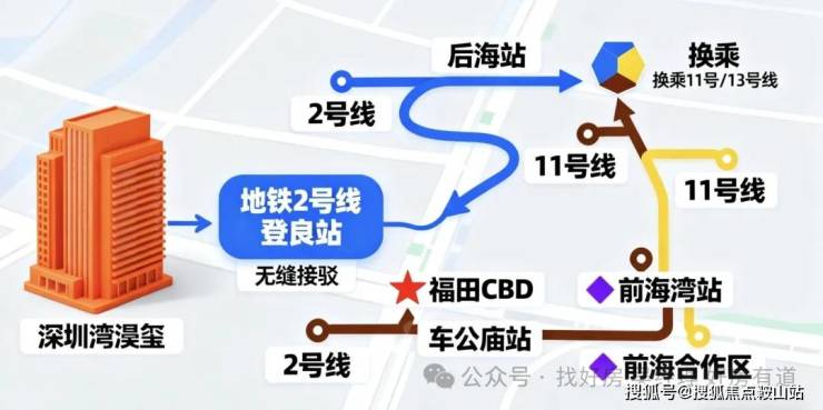 项目无缝接驳地铁2号线登良站,1站可到后海站;1站换乘11号/13号地铁线,3站达福田CBD(车公庙站)、前海合作区(前海湾站)。