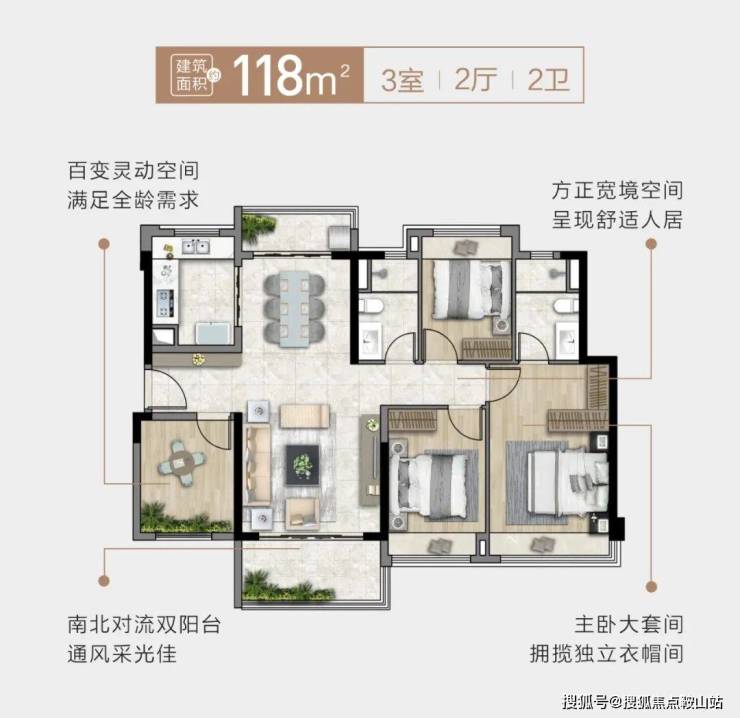 还有建面约118㎡3+1房,南北双阳台对流,通风、采光俱佳,不仅让日常洗晾衣物有了去处,还能有观赏美景的空间。