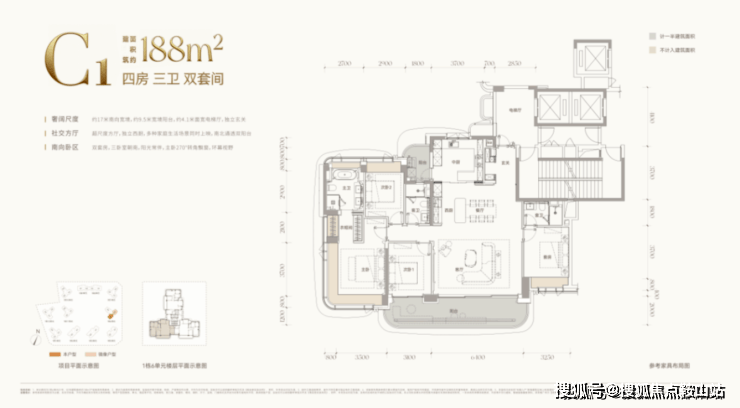 2梯2户,专梯入户。270°环幕阳台,客餐厅约7米面宽,约69㎡社交方厅。南向三套房设计,约18米南向面宽。