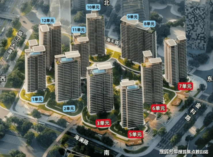 主阳台开间约9.5米,客餐厅开间约6.4米。三梯三户,独立私家门厅。东南或西南朝向,可看海景、摩天轮、城市景观。双套间设计,可做4+1房,中西双厨。