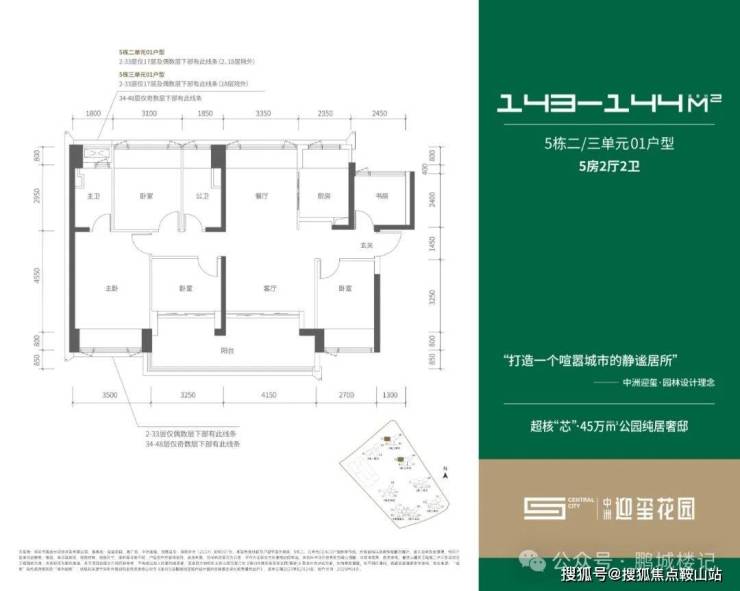 【五栋二、三单元-平面图】,48F,3T4,户型为约96㎡3房2卫(竖厅),180套;约115㎡4房2卫(南北通),90套;约143-144㎡5房2卫(南北通),90套;与三期3栋1单元户型完全一样。01/02/03户型正南向看小区内部花园,视野开阔;04户型东南向,靠近道路外侧,看小区花园。