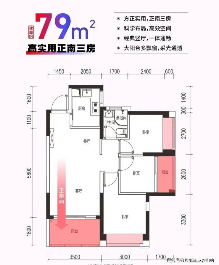 1、户型:建筑面积约78-79㎡极致三房两厅一卫,稀缺高性价比三房