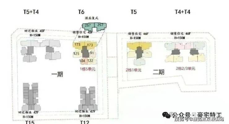 首推一期1栋5单元(45层),91-173㎡3-4房,共232套,以122-175平米4房为主,占比83%,还有两套257平顶复产品。173/257平大户型双电梯独立电梯厅入户,南区91-125平户型3梯4户。
