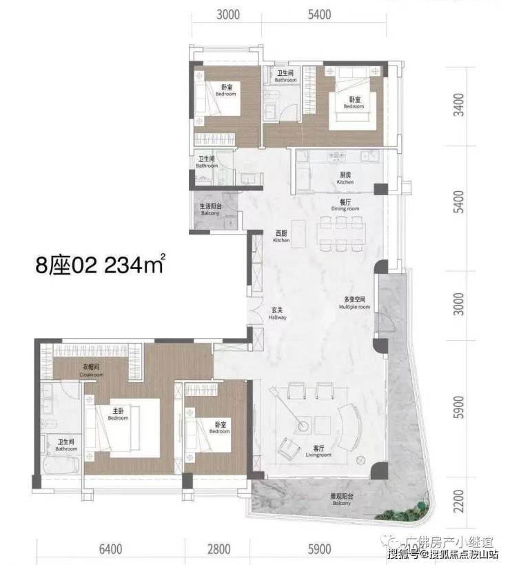 8栋01户型是建面约236㎡的四房两厅三卫、双套房主卧、中西双厨设计、超大方厅,整体空间尺度阔绰,客厅开间近6米,光客厅都65个方,转角弧形阳台19米长,非常奢侈