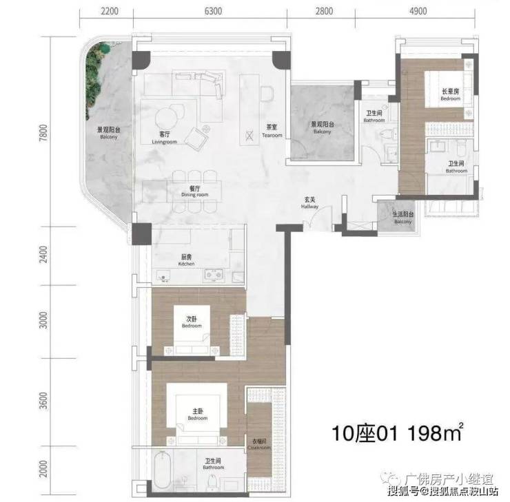2户178方和1户198方,其中198方,阳台近7.8米长,同样也是双套房。