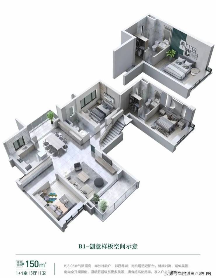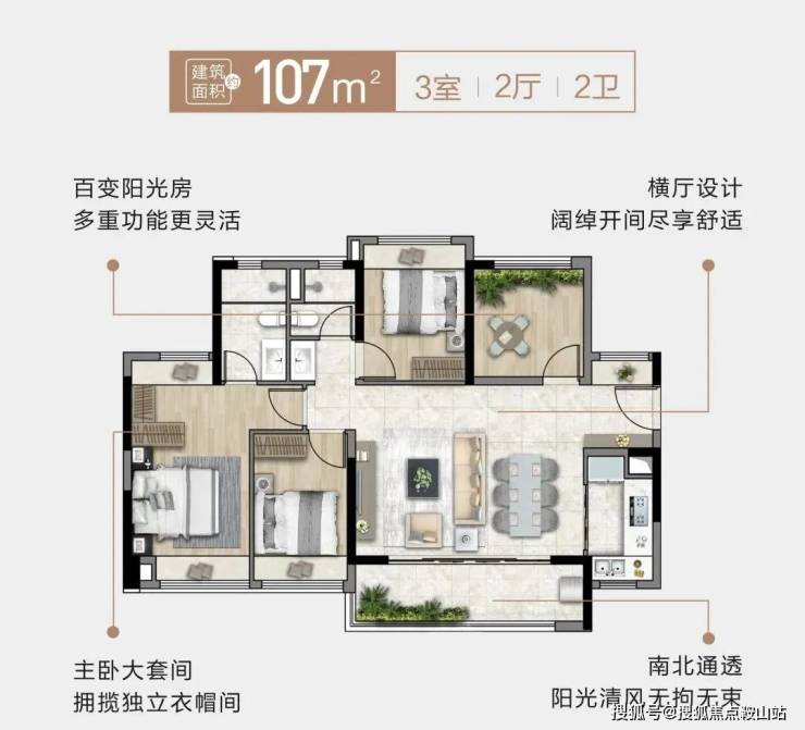 拥有南北通透双阳台,让居住空间更显大气。双主卧套间设计,采用南向全飘窗,细节之处彰显主人尊崇。超高的使用率,功能上回归家庭,布局上强调平衡,让空间更实用。