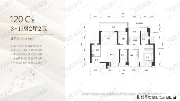 120㎡的4房2厅2卫,C户型(2栋3单元01户型),设计的是竖厅格局,客厅3.85米开间,LDKB一体化设计,动静分区,4个卧室分别做到了主卧16.65㎡/次卧9.9㎡/次卧9.16㎡/次卧6.3㎡(包含墙体飘窗),客厅连接次卧出6.1米长的宽景大阳台,U型厨房,卫生间干湿分离,得房率约90%(包含赠送),西北朝向。