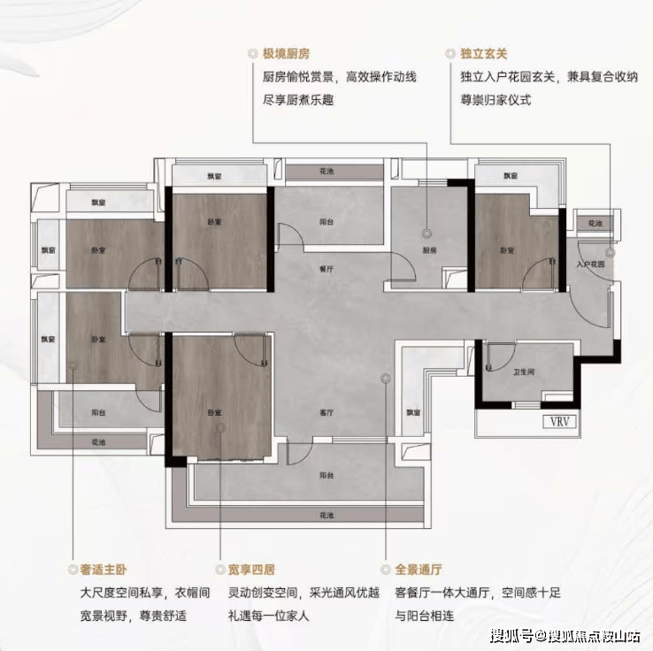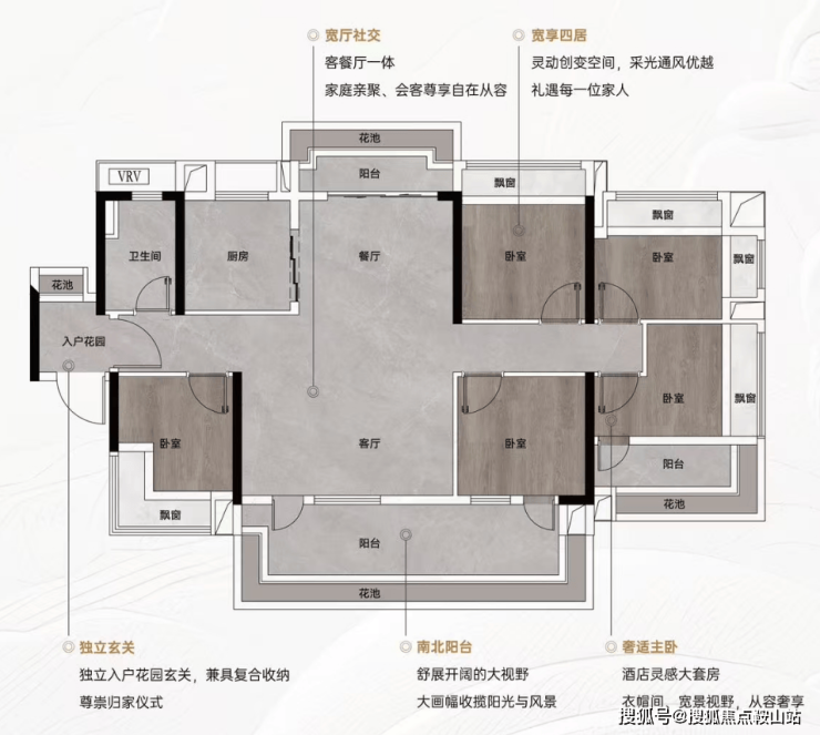是个南北对流的户型,四开间朝南。南面做了宽阳台的设计,加上花池的赠送,空间阔绰;北面餐厅报备了花池,可做餐边柜摆放杂物形成对流。