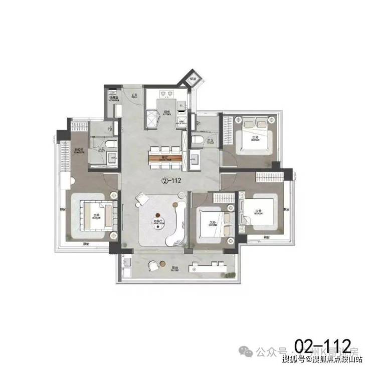 建面约105平户型,四开间构筑约12.8米南向面宽,带来超强通风、全明采光。