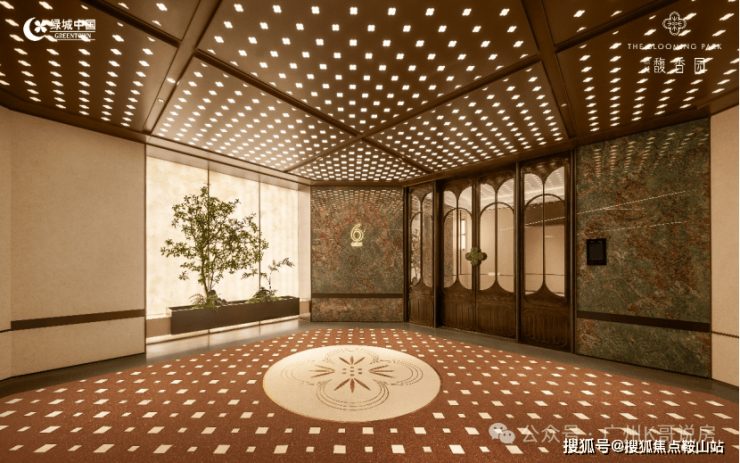 首层大堂背景墙选用的海浪绿岩板,杰尼亚灰石材通铺、水刀拼花工艺,海派精致美学尽显。