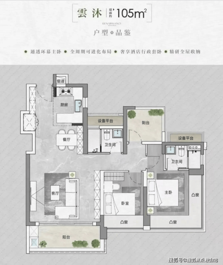 面积与户型:推售房源涵盖建面约90-95-105-143㎡的3-4房,共298套可售房源。其中,95/105㎡三房户型以朝东为主;90㎡三房户型朝西;143㎡四房大户型东南朝向。• 得房率:通过创新性的飘窗、双阳台改造、设备平台赠送等设计,实现平均94-96%的惊人得房率。