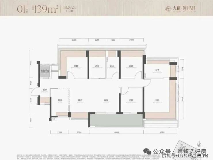 户型为113-114-115㎡四房和139㎡五房,标准层布局与保利瑧誉非常类似,但是没做独立电梯厅,2梯5户使用率高,凸窗做满再加上设备平台,所以赠送后得房率去到100%。