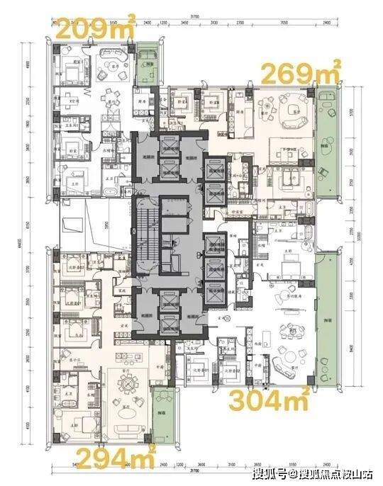 ①低中区5F起(150米以内)是约209-304㎡四房以上大户型;