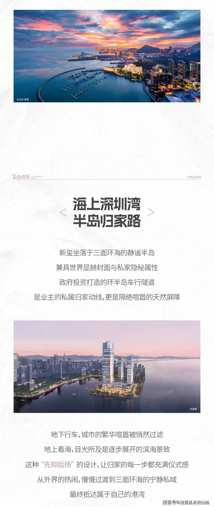 驶入半岛归家路的那一刻,城市的繁华喧嚣已被悄然过滤,它像一道分水岭,一边是深圳湾的璀璨繁华、一边是半岛的静谧私享,完美匹配了海上时代概念下对繁华城市与宁静生活的兼容。