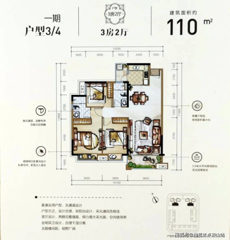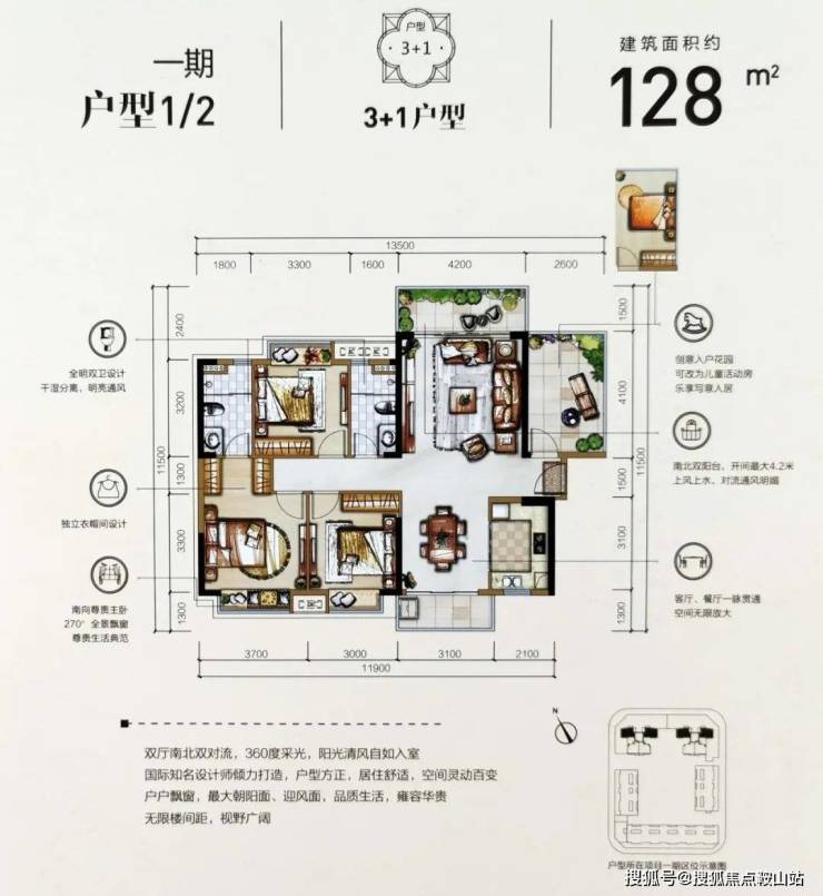 建面128㎡的四房对应的是1户型和2户型,双阳台设计保证了采光和通风,朝向都做到南北通透,这样居住起来是比较舒适的。