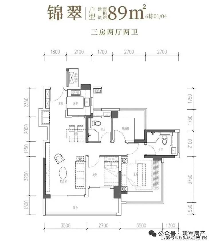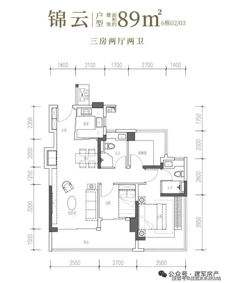 89㎡的3房2厅2卫,6栋02/03户型,设计的是经典竖厅格局,客厅3.5米开间,LDKB一体化,S墙设计预留冰箱卡槽位,三开间朝南,动静分区,主卧+次卧270°无柱转角飘窗,分别做到了主卧15.25㎡/次卧7.56㎡/次卧6.48㎡(包含墙体飘窗),U型厨房烟道外置,卫生间干湿分离,得房率约97.47%(包含赠送),客厅连接次卧出大阳台约11.46平,西南或东南朝向。主要区别在于次卧跟主卫空间。