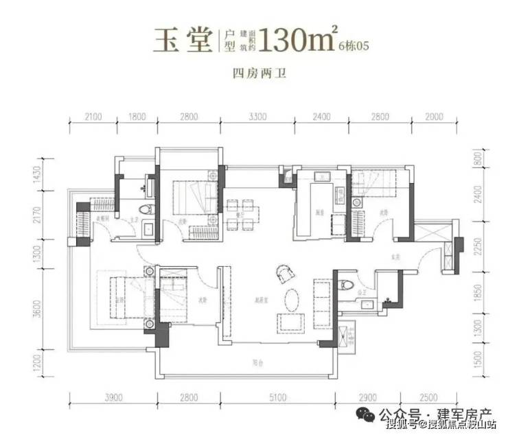 130㎡的4房2厅2卫,设计的是竖厅南北通透格局,进门独立玄关,客厅5.1米开间,客餐厅分离化设计,主卧270°无柱转角飘窗+衣帽间,分别做到了主卧23.66㎡/次卧11.2㎡/次卧8.96㎡/次卧7.84㎡(包含墙体飘窗),U型厨房烟道外置,卫生间干湿分离,得房率约101.95%(包含赠送),客厅连接次卧出超大阳台约14.09平,东北朝向。