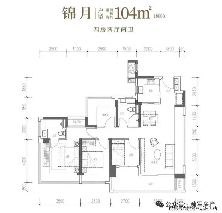 104㎡的4房2厅2卫,设计的是竖厅格局,客厅4.15米开间,LDKB一体化设计,预留冰箱卡槽位,四开间朝南,动静分区,主卧270°无柱转角飘窗还带1个设备平台约1.52平,分别做到了主卧20.34㎡/次卧11.2㎡/次卧7.7㎡/次卧6.75㎡(包含墙体飘窗),U型厨房烟道外置,卫生间干湿分离,得房率约100.71%(包含赠送),客厅连接次卧出大阳台约11.23平,西南朝向。