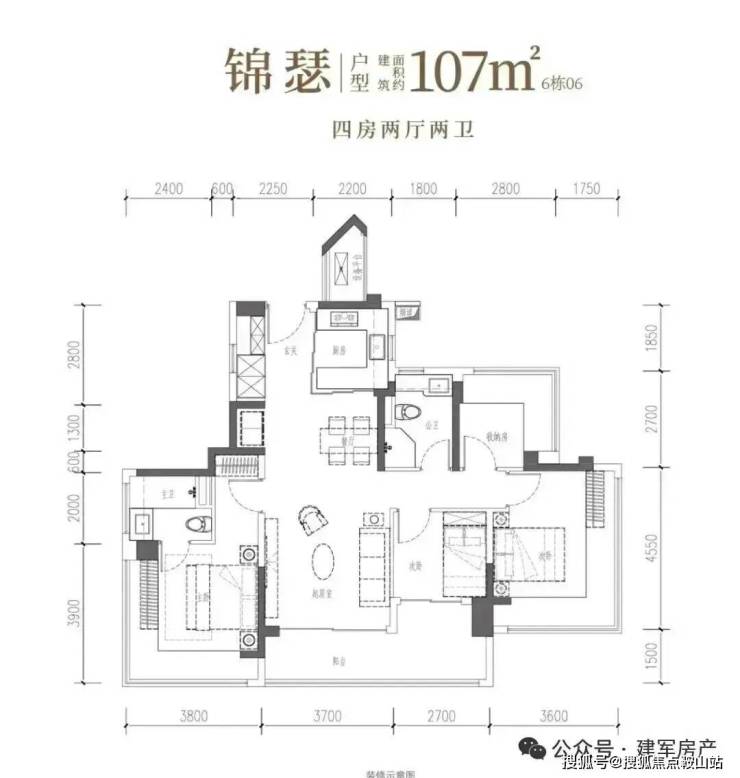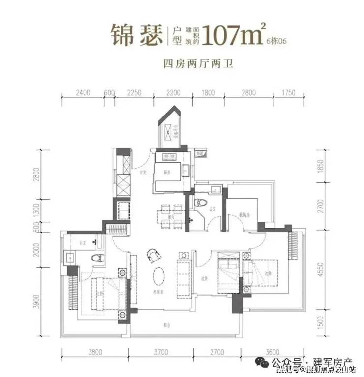 107㎡的4房2厅2卫,设计的是竖厅双龙抱珠格局,客厅3.7米开间,LDKB一体化设计,预留冰箱卡槽位,四开间朝南,主卧+2个次卧270°无柱转角飘窗,分别做到了主卧17.94㎡/次卧16.38㎡/次卧7.56㎡/次卧6.89㎡(包含墙体飘窗),U型厨房烟道外置,卫生间干湿分离,得房率约104.06%(包含赠送),客厅连接次卧出超大阳台约11.76平,东北朝向。