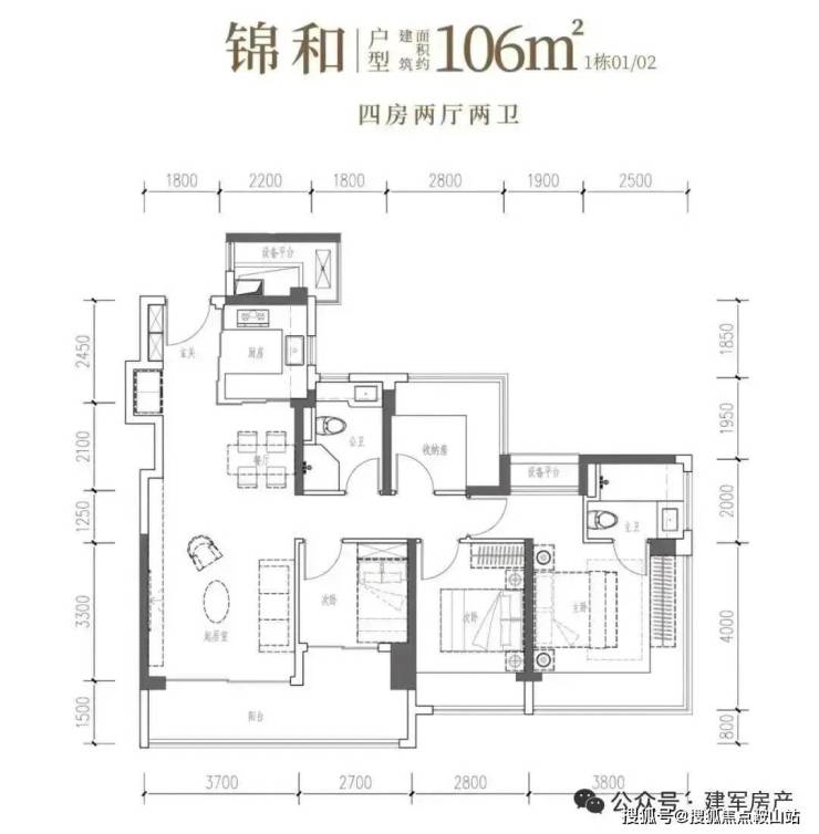 106㎡的4房2厅2卫,设计的是竖厅格局,客厅3.7米开间,LDKB一体化,S墙设计预留冰箱卡槽位,四开间朝南,动静分区,主卧270°无柱转角飘窗还带1个设备平台约1.52平,分别做到了主卧20.34㎡/次卧11.2㎡/次卧7.7㎡/次卧6.75㎡(包含墙体飘窗),U型厨房烟道外置,卫生间干湿分离,得房率约101.16%(包含赠送),客厅连接次卧出大阳台约11.76平,东南朝向。