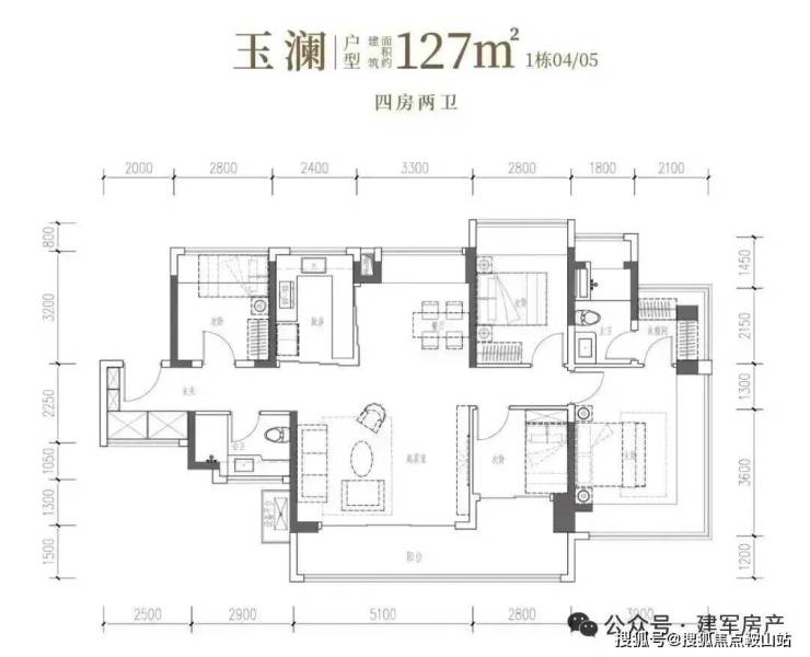 127㎡的4房2厅2卫,设计的是竖厅南北通透格局,进门独立玄关,客厅5.1米开间,客餐厅分离化设计,主卧270°无柱转角飘窗+衣帽间,分别做到了主卧18.55㎡/次卧11.2㎡/次卧8.96㎡/次卧7.84㎡(包含墙体飘窗),U型厨房烟道外置,卫生间干湿分离,得房率约98.97%(包含赠送),客厅连接次卧出超大阳台约14.09平,西南或东南朝向。