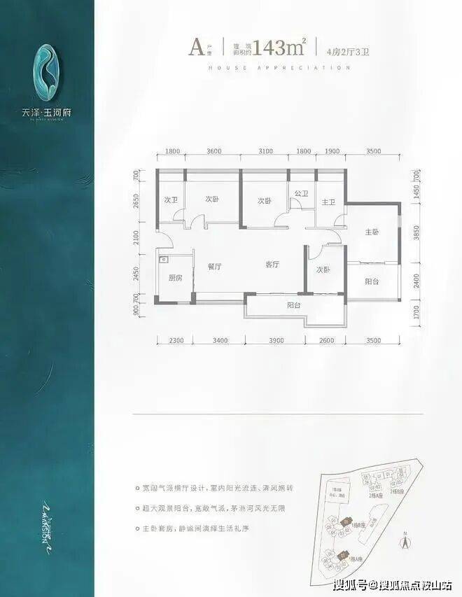 143㎡四房三卫(A户型):横厅设计,客餐厅开间达7.3米,6.5米观景阳台,双主卧套房+独立家政间,得房率91.1%。景观视野,东南向一线茅洲河景,高区可眺望石岩湖