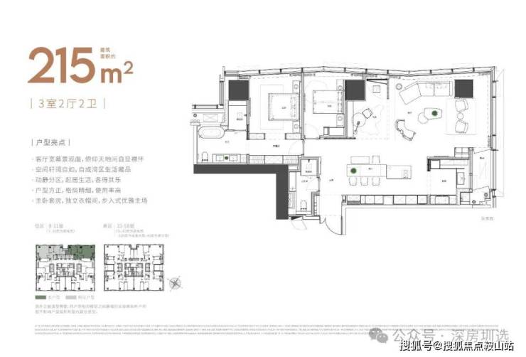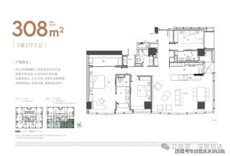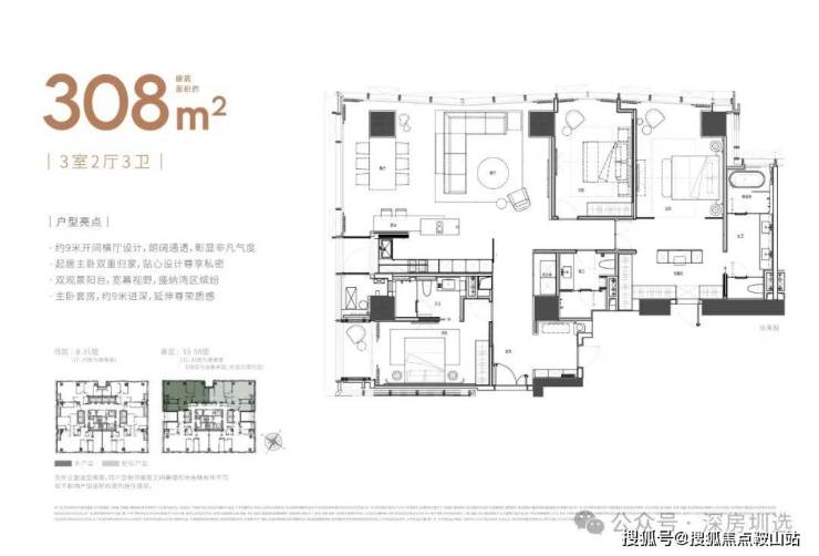 大平面大尺度定位,层高约3.6米,横厅设计确保最大化观景面,全户型纵享环幕视野。项目打造建面约215-415㎡纯粹品质公寓191席,顶层建面约1270㎡公寓,署名“太子湾”。