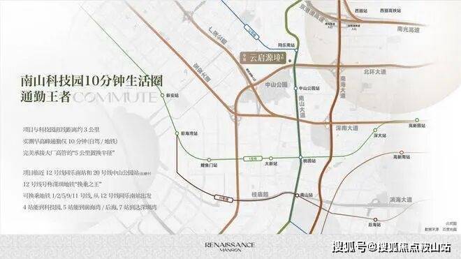 中海云启源境落址南山区南头街道核心,地处南山与宝安衔接处,紧邻北环大道、南山大道等城市干道,交通路网四通八达,便捷通达科技园、前海等核心区域。临近地铁12号线同乐南站,2028年15号线通车后将实现双地铁交汇,4站直达科技园,适配科创人才通勤需求;南侧紧邻49万㎡中山公园,坐享南山核心地段与生态资源双重加持,是刚改家庭的优选之地。