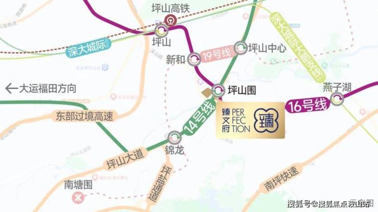 ★双轨交汇——300米坪山唯此14/16号线交汇站(坪山围站),价值对标岗厦北/大运/布吉枢纽。14号线5站达大运中心,13站直达福田岗厦北,与11号线串联深圳东西;16号线2站坪山高铁站。未来1站换乘19号线(规划),2站换乘深大城际(在建)。