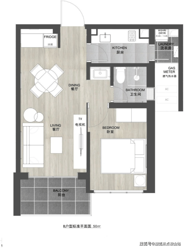 50㎡1房,带生活阳台,传统一房一厅布局。
