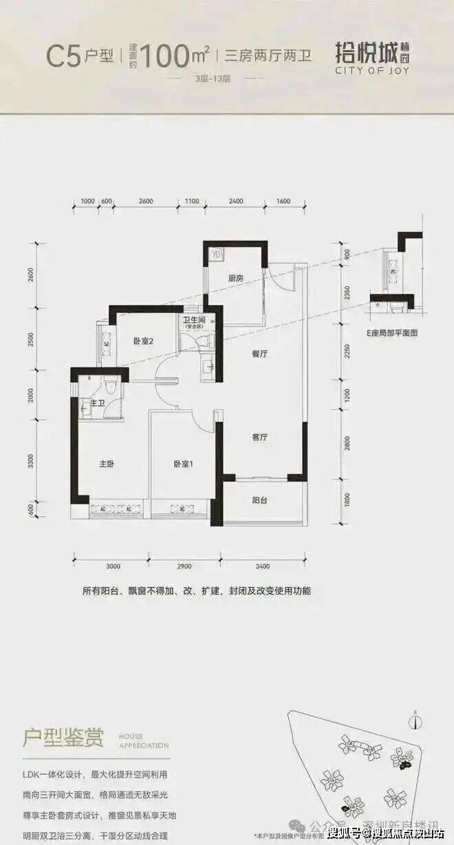 100平三房:设计的是竖厅格局,进门入户玄关,客厅3.4米开间,LDKB一体化设计,3个卧室分别做到了3米/2.9米/2.5米的宽度,U型厨房,公卫三段式分离,得房率:77.14%(不含赠送),阳台1.8米宽度,西南或东南朝向。