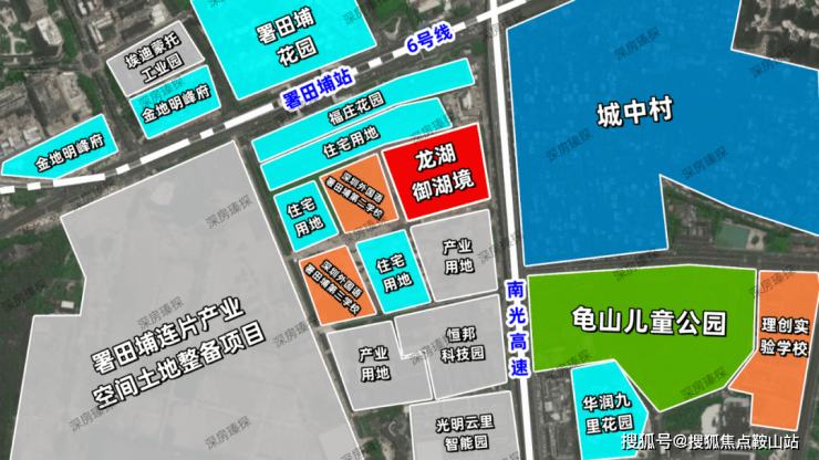 龙湖御湖境,位于光明区马田街道公明西环大道与健兴路交汇处西北侧,项目西北侧是去年入市的金地明峰府,西侧规划1所九年制60班公办学校,东南侧是署田埔龟山花园,南侧是科技园区,东侧当前是大片的城中村,6号地铁线“署田埔站”距离约300米。