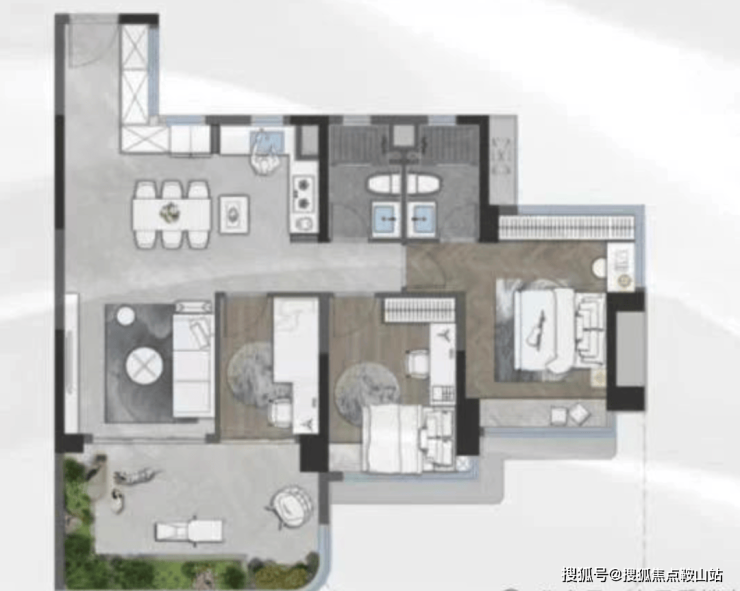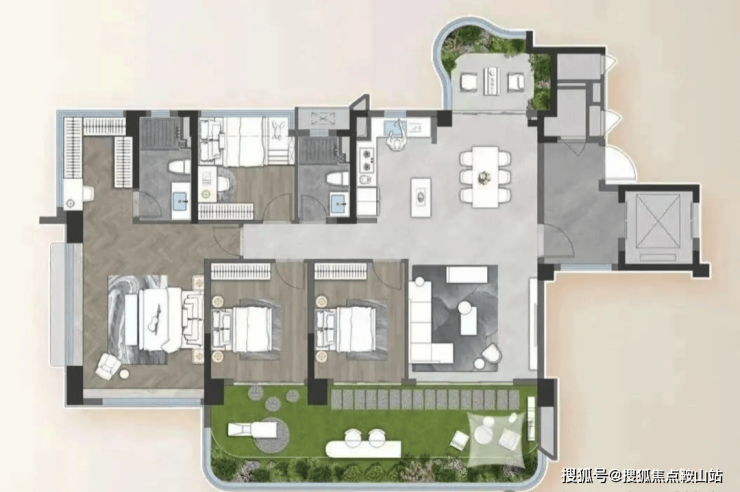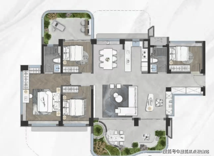 该户型把赠送面积都给了工区和主卧,全屋做到4+1房,空中花园连通公区,面积达到73㎡。最牛的是,主卧还带约14㎡的空中花园,打造一个私享庭院。