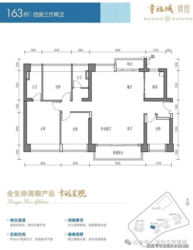 设计的是横厅南北通透格局,进门入户玄关,客厅5.9米开间,餐厨一体化设计,南北双阳台,全屋6个飘窗面,4个卧室分别做到了主卧18.31㎡/次卧12.4㎡/次卧10.15㎡/次卧9.45㎡(包含墙体飘窗),客厅出5.9米长的观景大阳台,U型厨房,公卫三段式分离,得房率约87.1%(包含赠送),阳台主朝东南向。