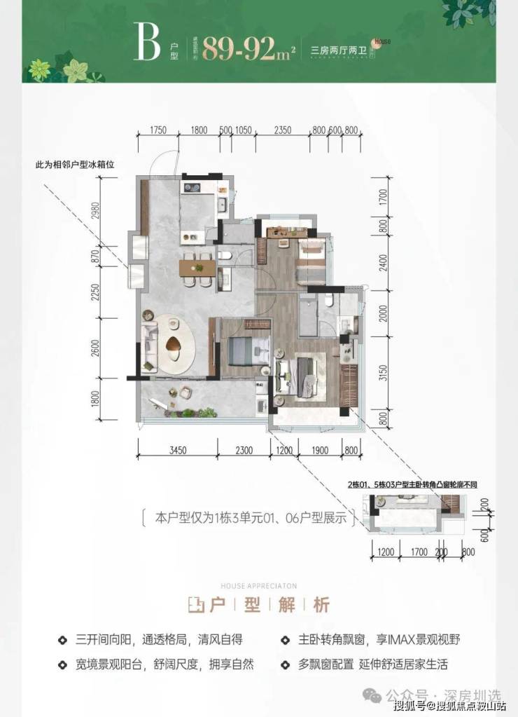 91㎡三房二卫(竖厅):双面L型主卧飘窗,全屋舒阔尺度;