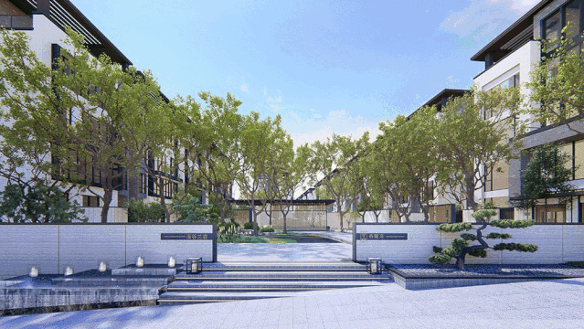 项目入口中轴区,曰“云山在望”,是初识香麓湾的第一站。以门为礼,形似“官帽”,营造山门初开,画卷缓缓开启的东方意境。主入口通道两侧植物依序排开,沿山势步步高升,可见凤凰山的云雾氤氲,引山景入卷。