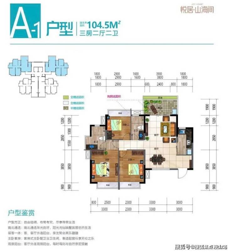 悦居·山海间在售户型面积约为101㎡~106㎡,包括三房两厅两卫和两房两厅一卫两种格局。户型方正,明厨明卫,动静分区合理,阔绰阳台设计,让居住空间更加宽敞明亮。其中,北朝向的三房两厅两卫户型全通透,采光极佳;南朝向的三房两厅两卫户型半通透,视野开阔。购房者可以根据自己的需求和喜好选择合适的户型。