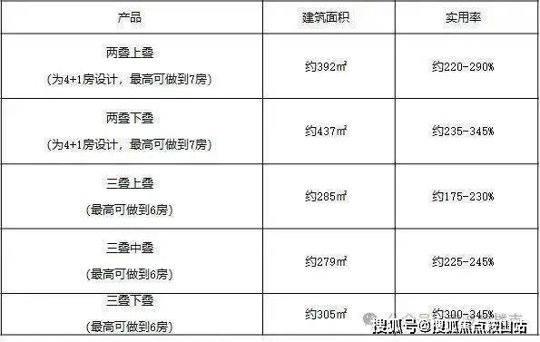 珑岸组团(叠墅):面积285-437平方米,容积率仅0.99,户户带私家电梯、独立花园及露台,使用率最高达345%,车位配比1:3至1:4。