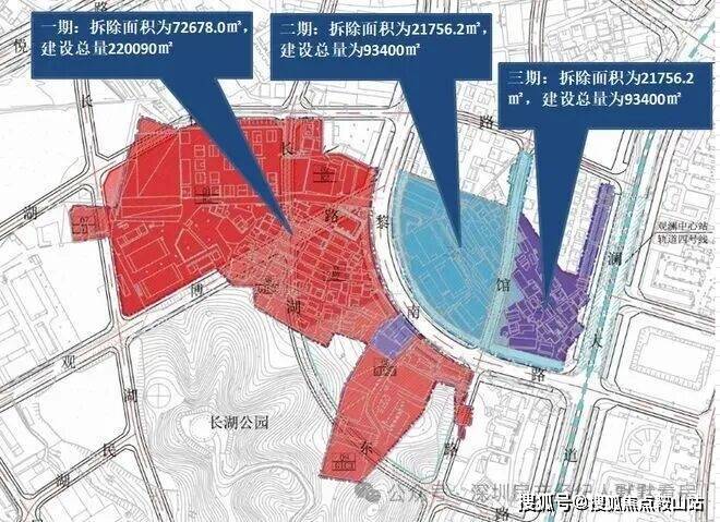 《万科启城》位于深圳市龙华区福城街道,项目地块原为长湖头村旧改更新单元,拆除用地面积10.65万㎡,是观澜最大的旧改项目之一,涉及富民及新和两社区。更新单元于2011年列入城市更新计划,2015年旧改范围内的部分建筑开始拆除,2020年龙华区成立三周年举办了首批重点项目集中开工仪式,万科的长湖头村旧改项目位列其中,至此项目才开始正式大规模拆除建设。根据规划,长湖头村旧改项目分为三期建设,根据此前公开资料显示,图中红颜色部分为一期拆除及建设范围,九年一贯制长湖学校也在其中,位于一期的最南端;图中蓝色部分为二期拆除及建设范围;图中紫色部分为三期拆除及建设范围。整体建成后,将是集住宅、商业、学校、公共配套于一体的大型综合社区。