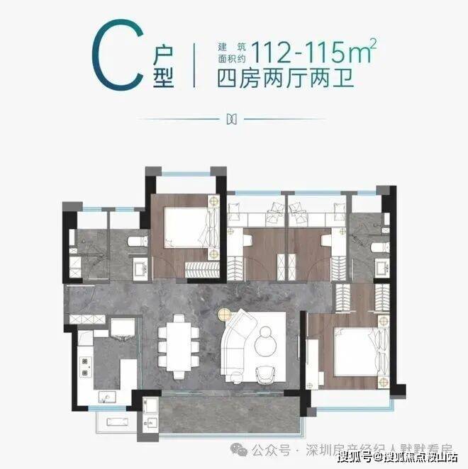 C户型:建面约112-115㎡四房两厅两卫,开阔景观横厅设计,格局通透,动静分区,约6米面宽大气景观阳台,包揽四季风光,LDK一体化中西厨房,有格调的人间烟火,双孩房,长辈房双边下床,尽心呵护家人,首置、改善,一步到位。