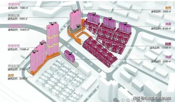 A区计容积率建筑面积约2.1万㎡,不计容积率建筑面积约5.2万㎡,为11栋主体(含幼儿园、商业),包含9栋“院子”别墅,地上3-4层,地下3层结构。