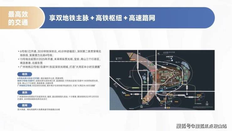 项目靠近地铁6号线【光明大街】站(已开通)直达福田,地铁13号线(在建)连接光明与深圳湾口岸。龙大高速、南光高速两大免费高速可快速通达全城。广深港高铁光明城站往返深圳北、福田便捷,赣深高铁及未来的莞深城际也在此交汇。