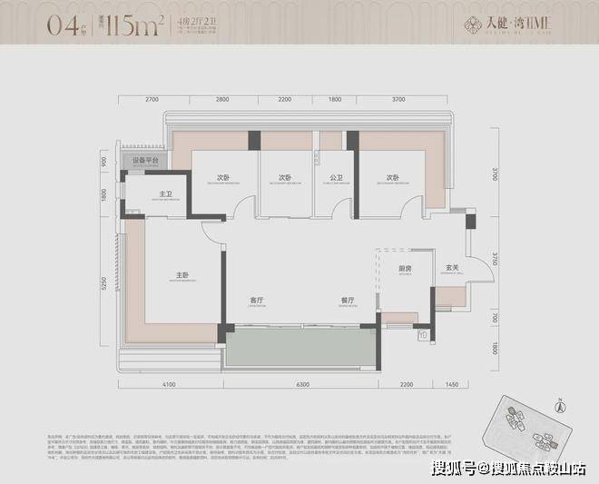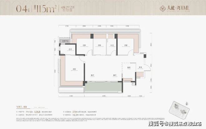 这个户型设计比较亮点的是餐客厅都能出阳台,而不是单边客厅出阳台。由于户型核心筒本身就外延了,不太受楼体遮挡也有充足的景观。对于115㎡户型来说,能够让整个客厅和阳台拥有同样的开间,可以把厅的开阔感做出来。