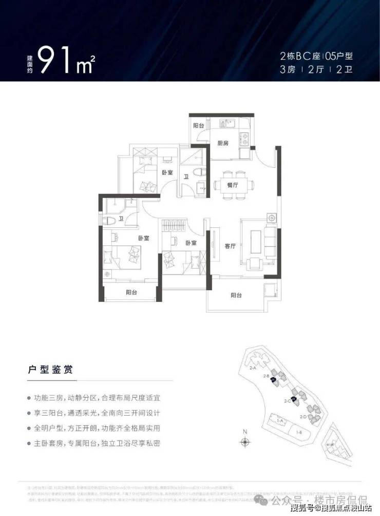 建面约78-129㎡3-4房户型方正,南北通透,享主卧、客厅、厨房三阳台设计,超高使用率,拥有超大景观面,居家即可观美景。